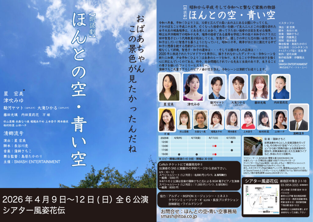 朗読劇「ほんとの空・青い空」全キャスト公開です! 2026 3/04 2026年4月9日(木)〜12日(日) シアター風姿花伝 チケットは各キャストのSNSで情報をゲット! よかったらシェアしてね! URLをコピーしました! URLをコピーしました! 2020年にラジオドラマとして放送した「ほんとうの空・青い空」が朗読劇「ほんとの空・青い空」として帰ってきます!